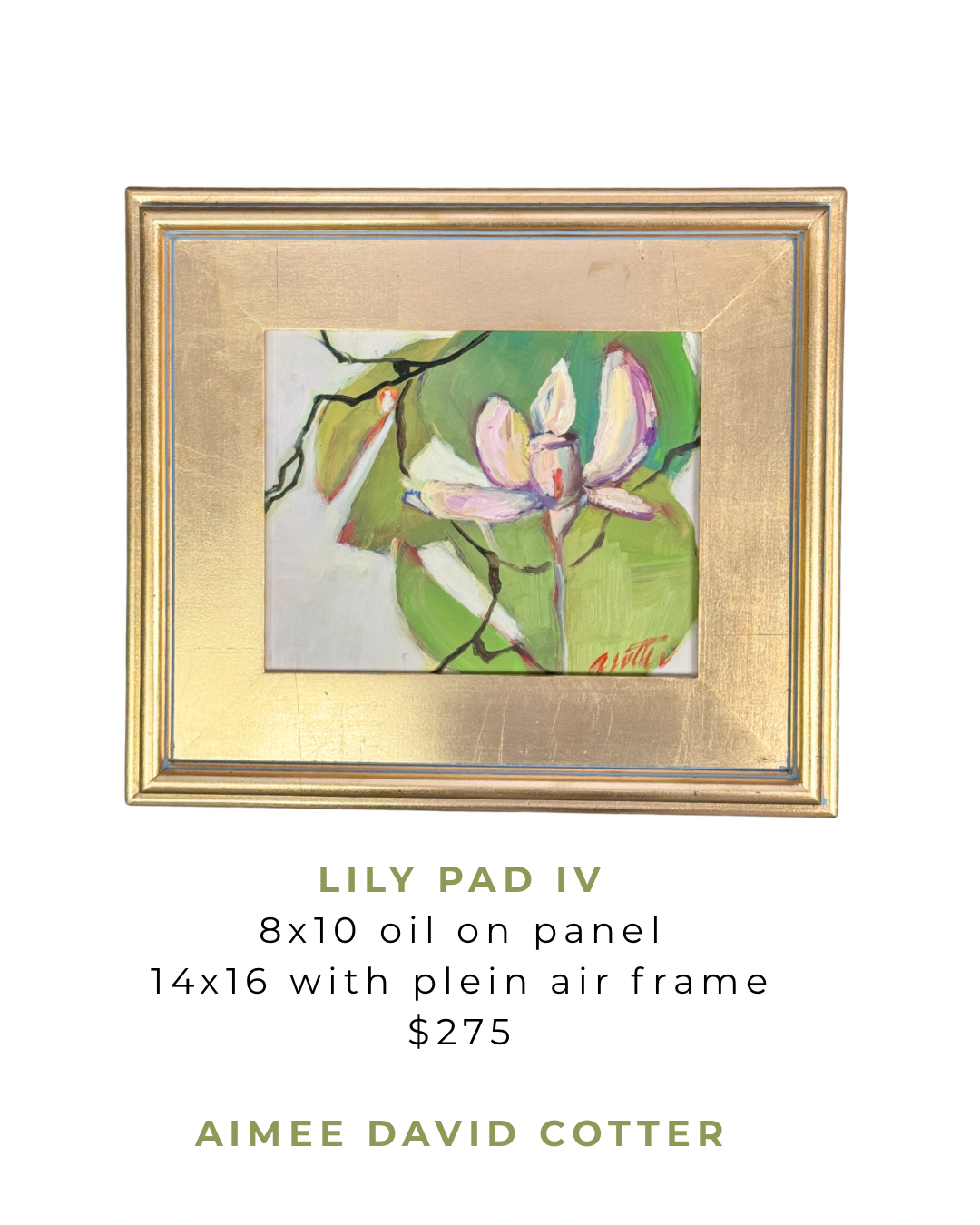 AVAILABLE PAINTINGS › Lily Pad IV Image 1 of 1 Lily Pad IV $275.00 sold out 14x16 original on panel in gold plein air frame. Available to ship on April 20. Sold Out Added! 14x16 original on panel in gold plein air frame. Available to ship on April 20.