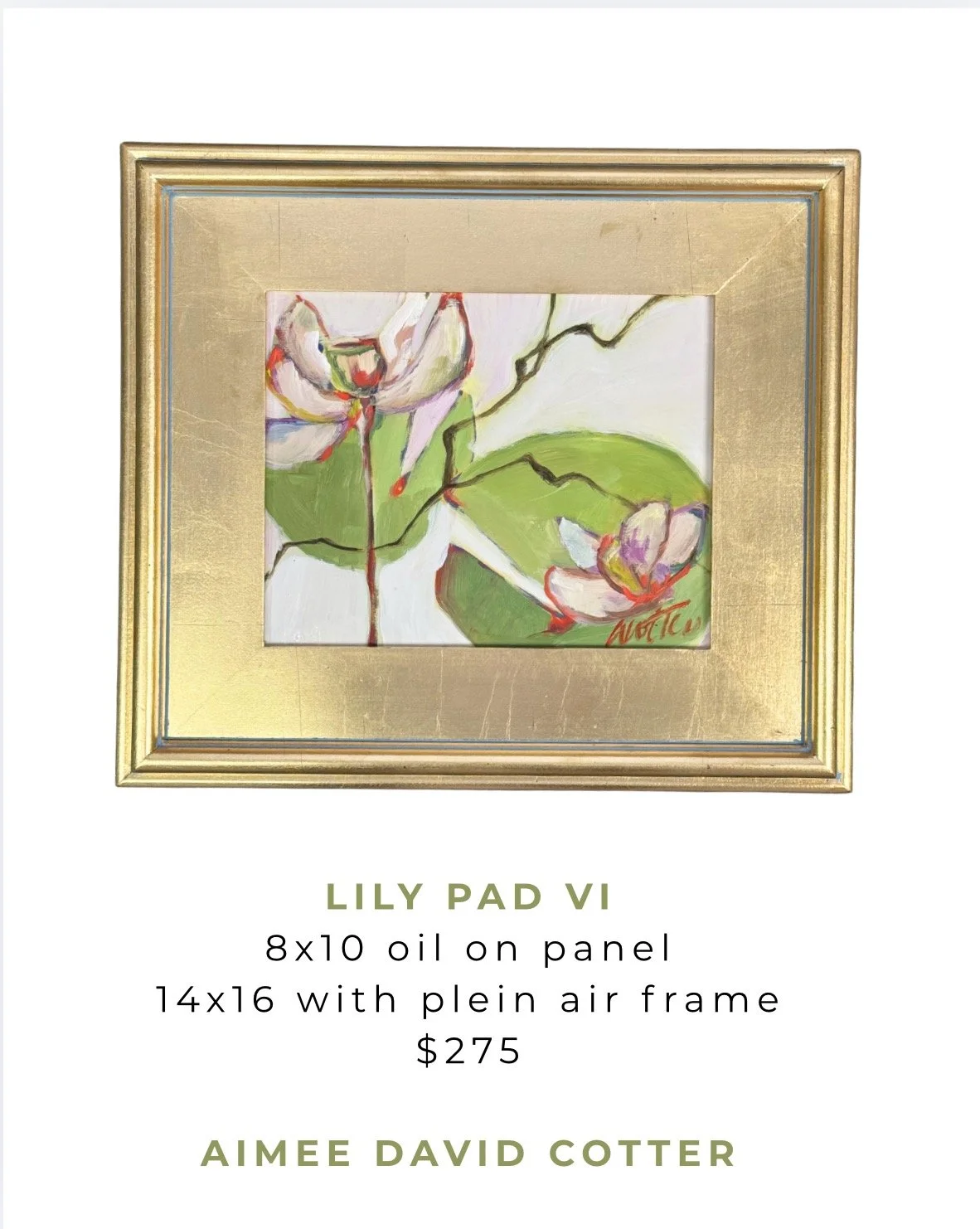 AVAILABLE PAINTINGS › Lily Pad VI Image 1 of 1 Lily Pad VI $0.00 sold out 14x16 original on panel in gold plein air frame. Available to ship on April 20. Sold Out Added! 14x16 original on panel in gold plein air frame. Available to ship on April 20.