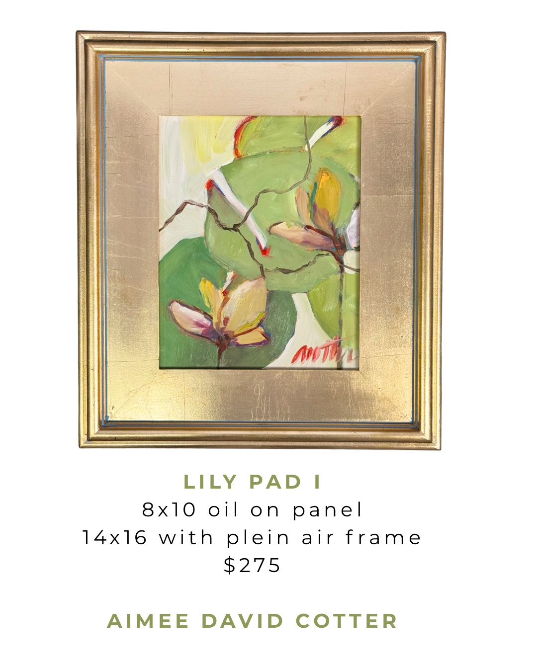 AVAILABLE PAINTINGS › Lily Pad 1 Image 1 of 1 Lily Pad 1 $275.00 sold out 14x16 original on panel in gold plein air frame. Available to ship on April 20. Sold Out Added! 14x16 original on panel in gold plein air frame. Available to ship on April 20.