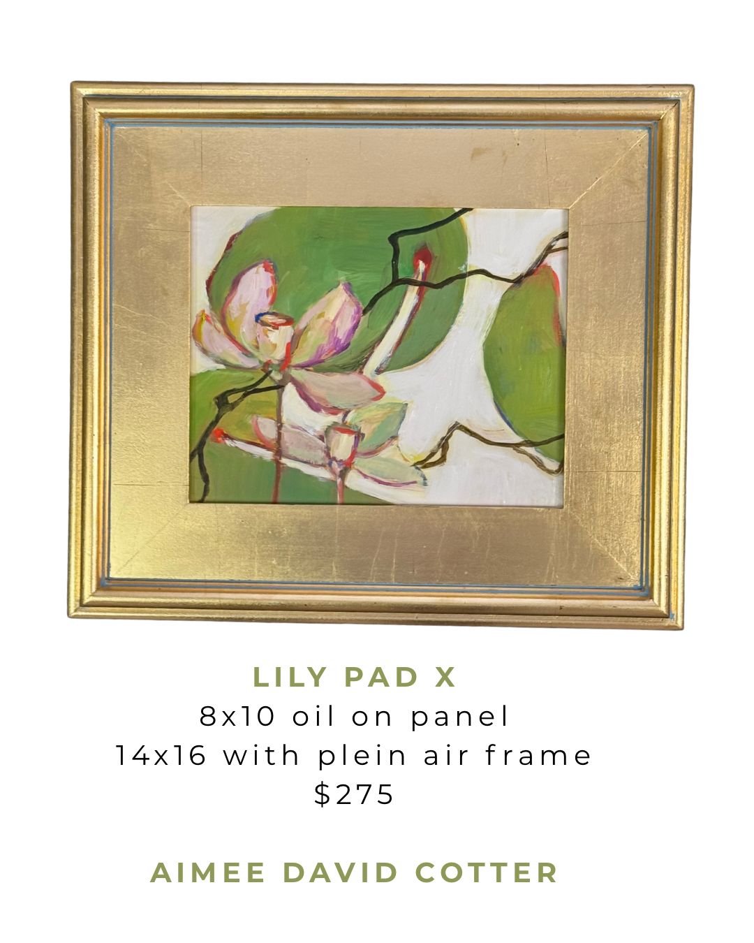 AVAILABLE PAINTINGS › Lily Pad X Image 1 of 1 Lily Pad X $275.00 sold out 14x16 original on panel in gold plein air frame. Available to ship on April 20. Sold Out Added! 14x16 original on panel in gold plein air frame. Available to ship on April 20.