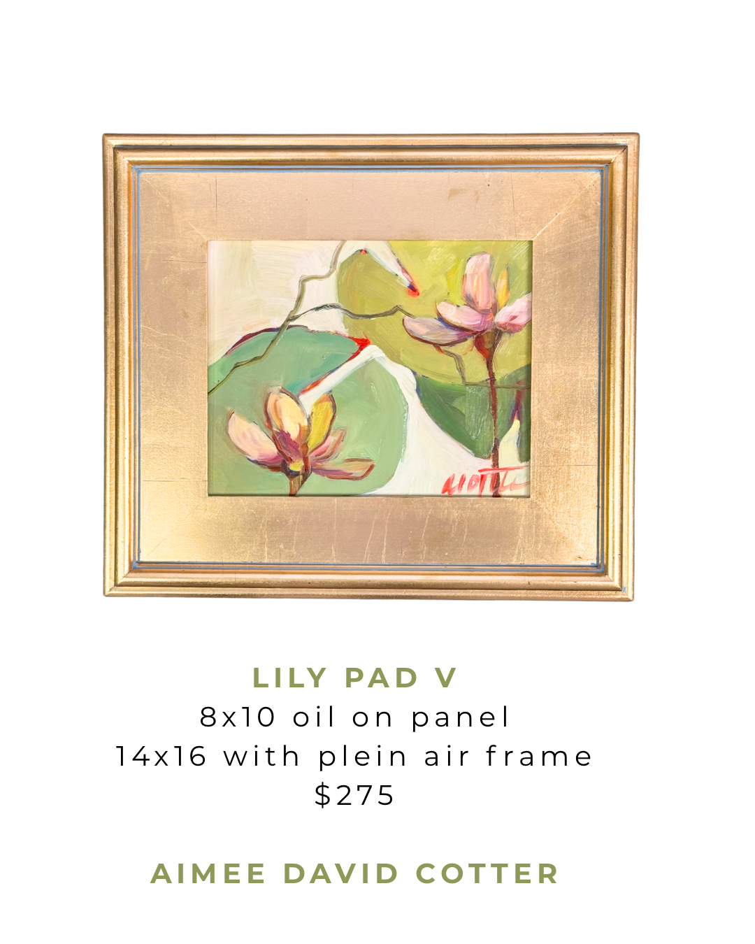 AVAILABLE PAINTINGS › Lily Pad V Image 1 of 1 Lily Pad V $275.00 sold out 14x16 original on panel in gold plein air frame. Available to ship on April 20. Sold Out Added! 14x16 original on panel in gold plein air frame. Available to ship on April 20.