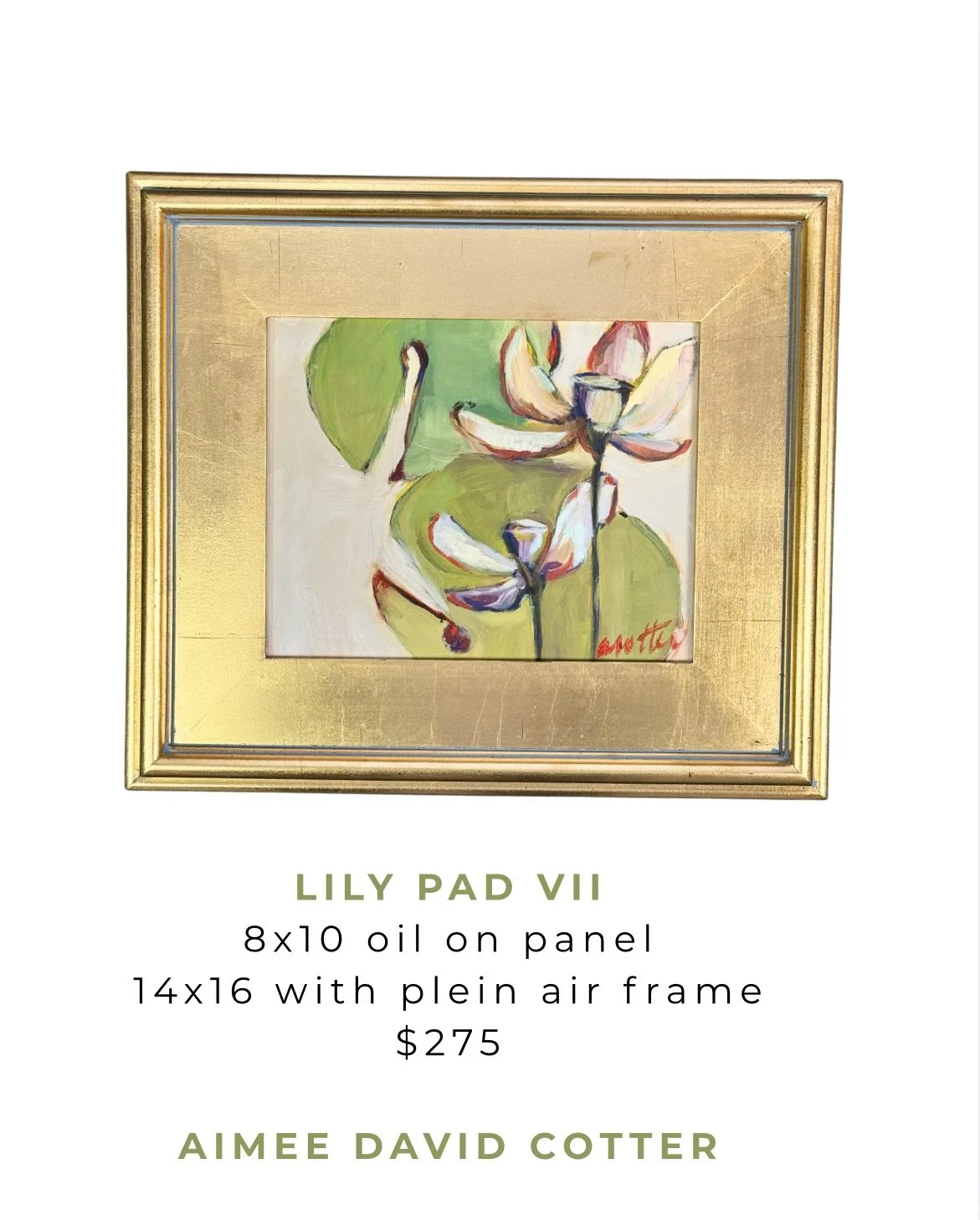 AVAILABLE PAINTINGS › Lily Pad VII Image 1 of 1 Lily Pad VII $275.00 sold out 14x16 original on panel in gold plein air frame. Available to ship on April 20. Sold Out Added! 14x16 original on panel in gold plein air frame. Available to ship on April 20.